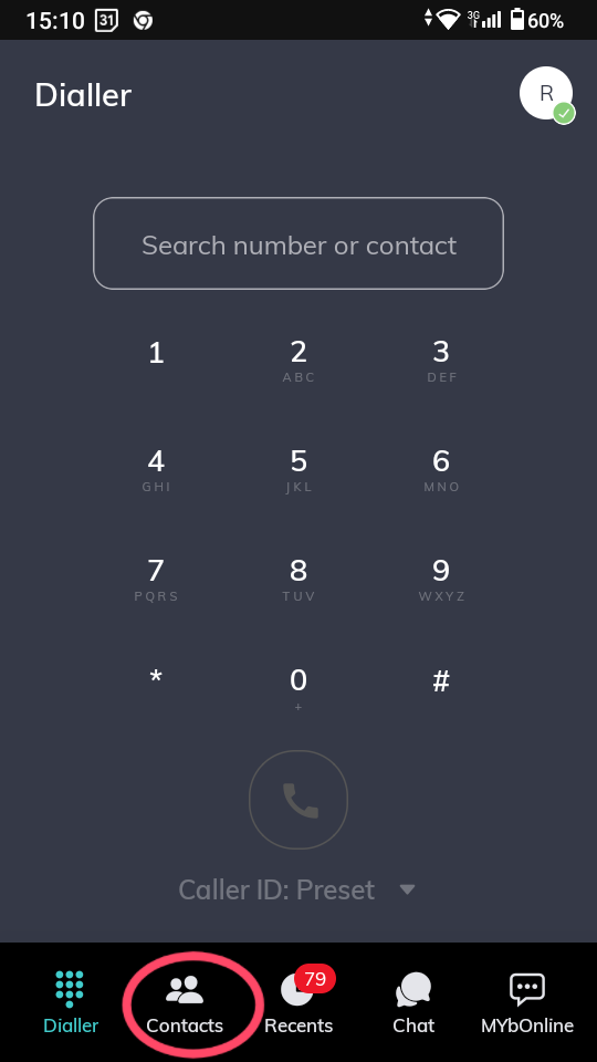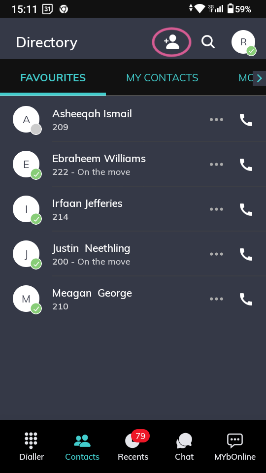 3. Tap the Add Contact icon (the plus '+' symbol) at the top-right of the screen. (Note: This icon is not visible if you are on the dialler screen)