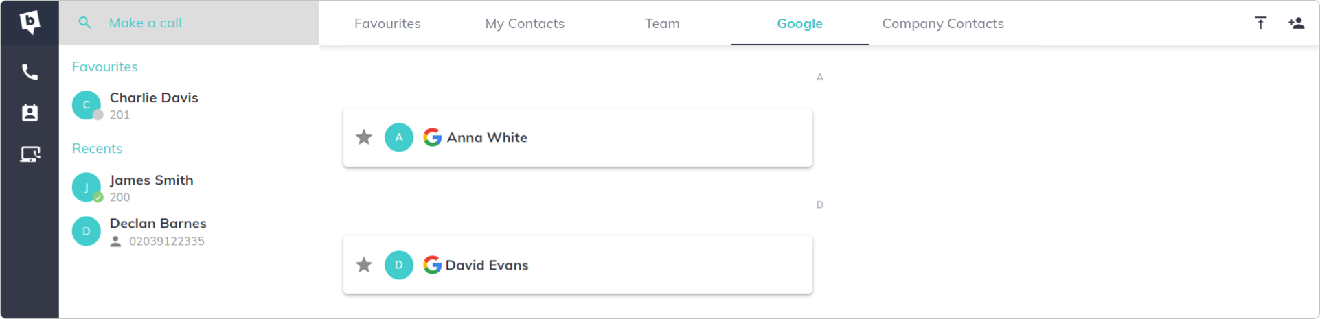 Once connected, a new tab will appear in the phonebook section of the desktop and mobile apps showing your synced contacts.