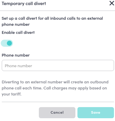 Diverting to an external number will create an outbound phone call each time. Call charges may apply based on your tariff.
