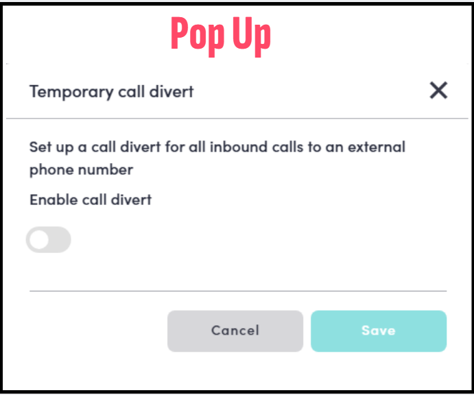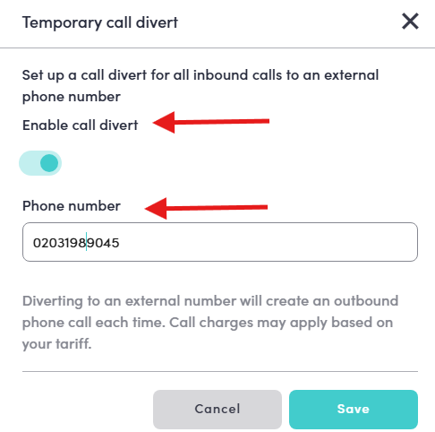 Once you click on Temporary divert, you will get a pop-up allowing you to apply the feature and enter the phone number you would like your calls to be diverted to.