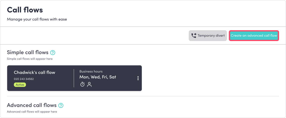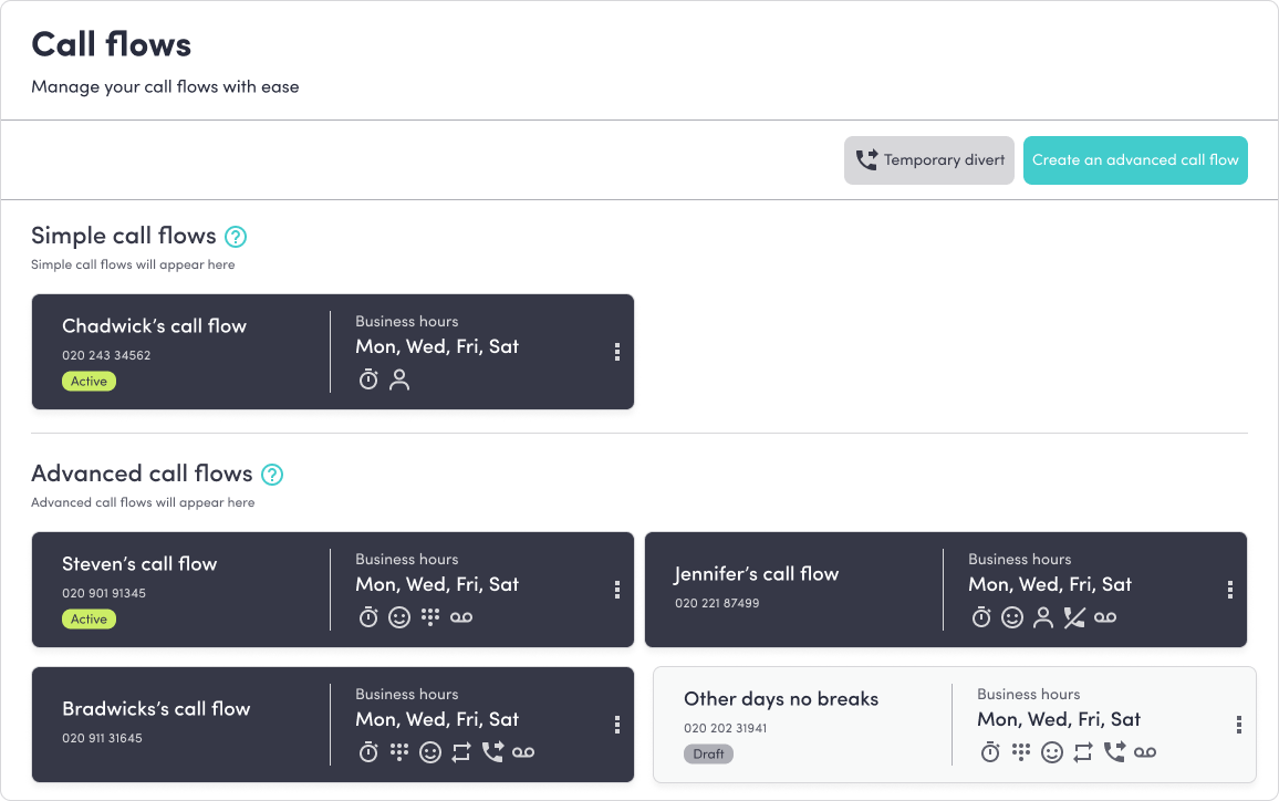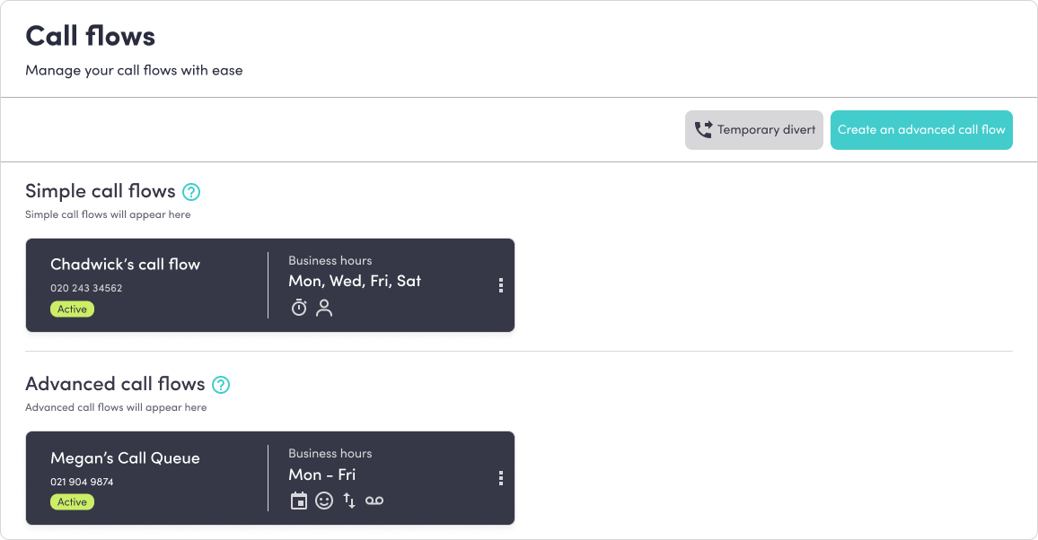 If your business only does one thing, a single call flow is enough, but if Sales, Support, Campaign A, and After-Hours all have different needs? Multiple Call Flows keep things organised, professional, and efficient. Each call flow is fully independent, meaning you can customise messages, business hours, routing logic, queues, and more, all running simultaneously.