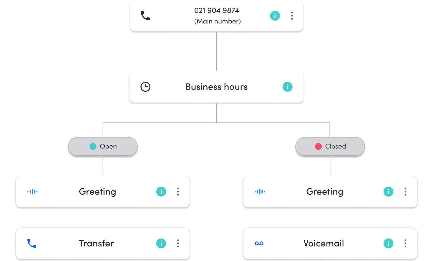 Icons representing their key actions (e.g., business hours, greeting, transfer, voicemail)